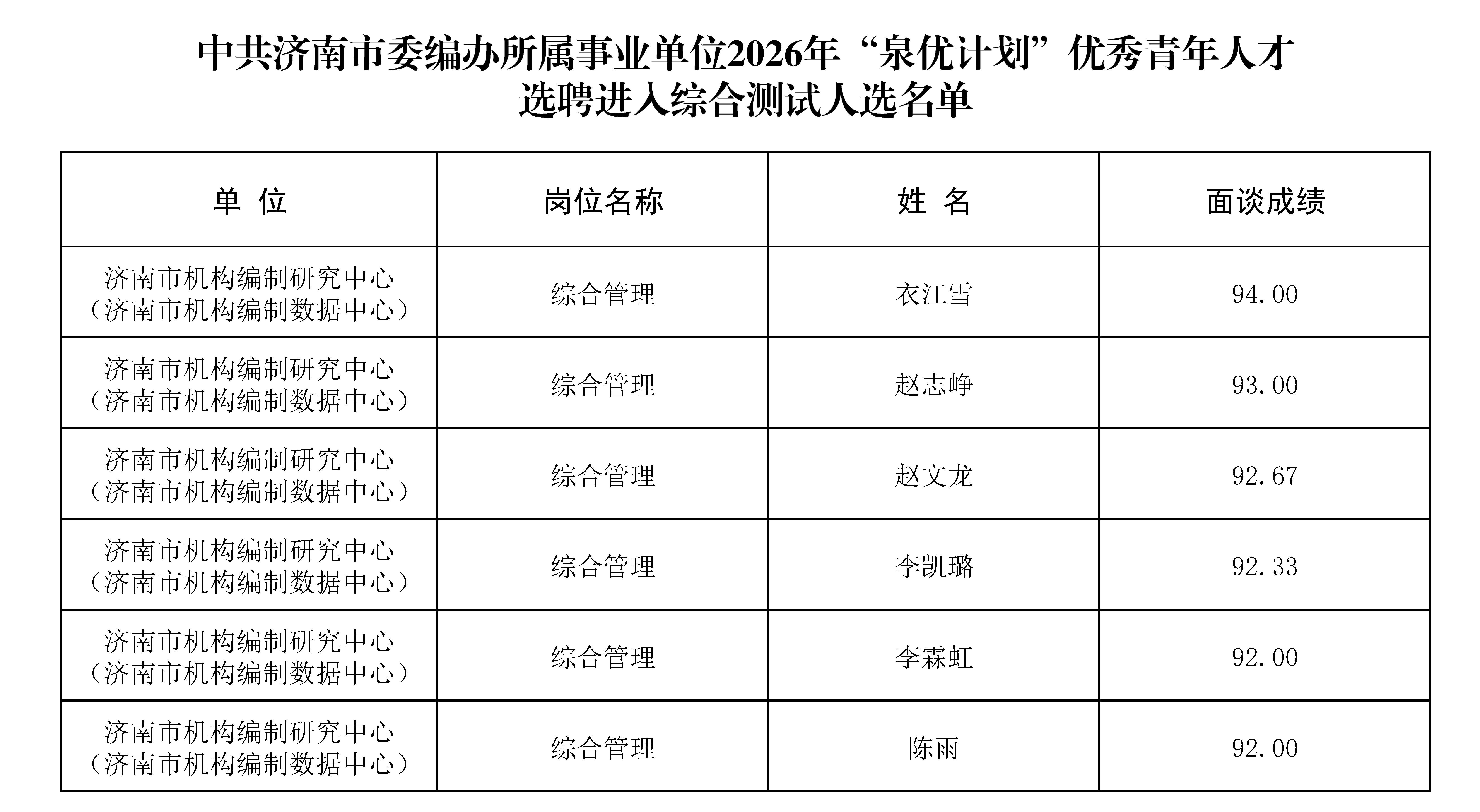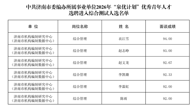 按照《济南市2026年“泉优计划”优秀青年人才选聘公告》有关规定,根据岗位招聘人数和面谈情况,济南市机构编制研究中心(济南市机构编制数据中心)进入综合测试范围人选已确定,现予以公布。